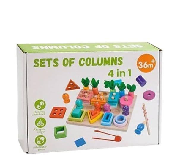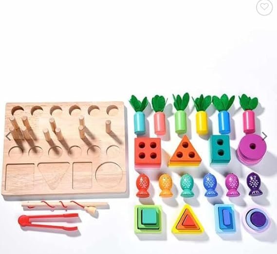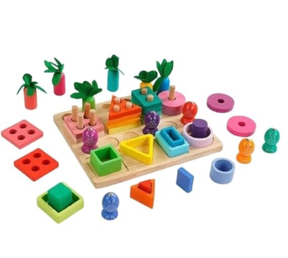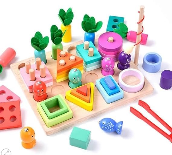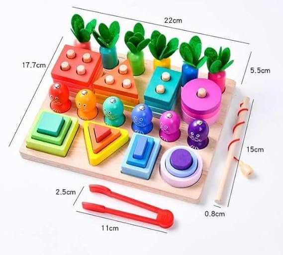๐ฃ 4-in-1 Learning Toy โ Magnetic fishing, carrot harvesting, shape stacking & size sorting in one set.