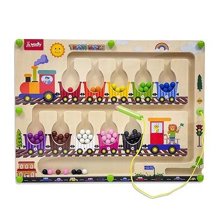 Exciting Magnetic Train Maze Board that teaches kids problem-solving, hand-eye coordination, and patience while having fun guiding colorful balls with a magnetic pen.