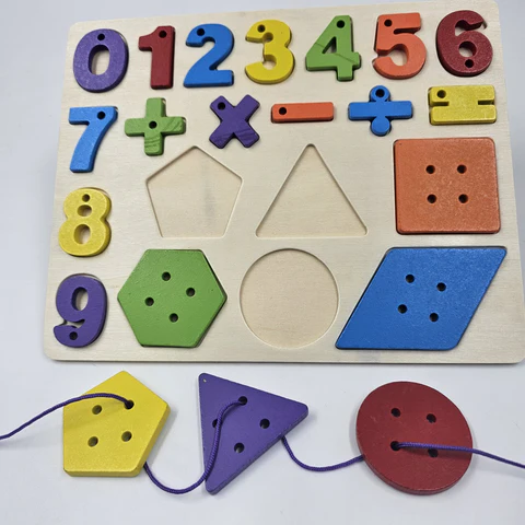 Interactive wooden numbers lacing board that helps kids learn numbers, counting, and sequencing while improving fine motor skills.