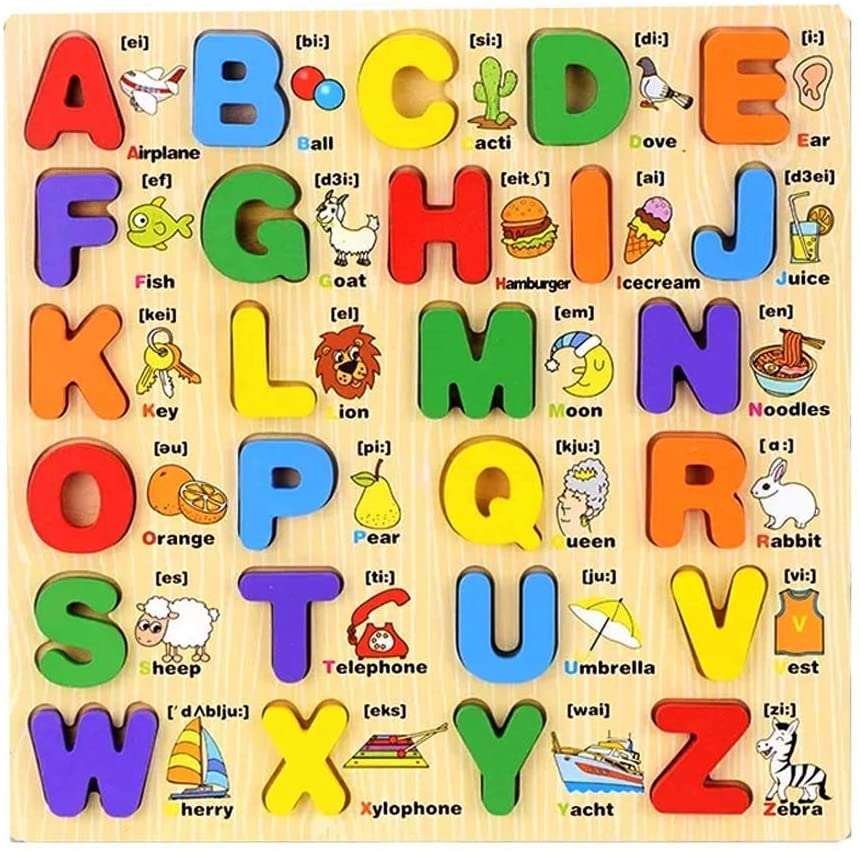 Fun and educational Wooden Capital ABC Board with Pictures designed to teach kids letters, words, and object recognition & perfect for early learning and preschool playtime.