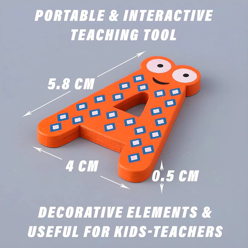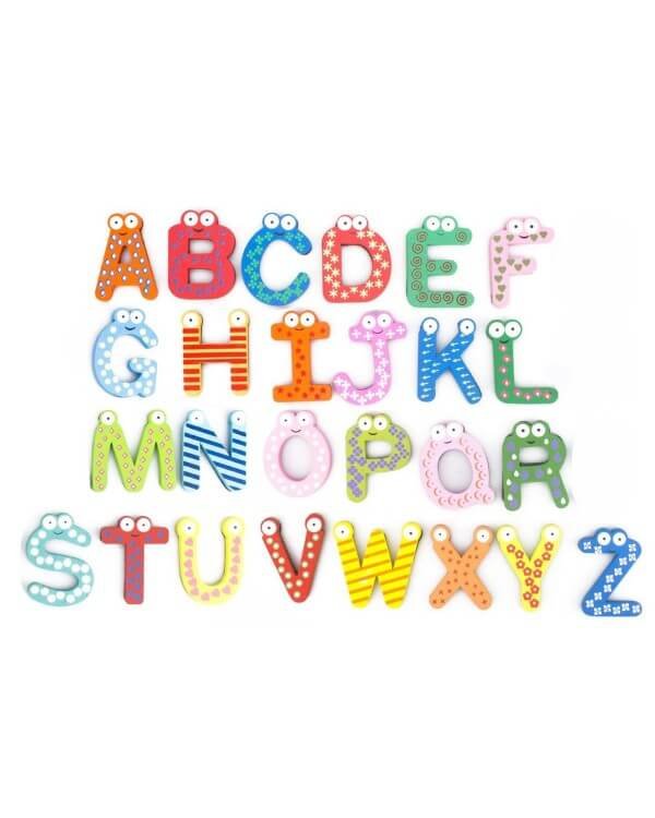 Bright and colorful wooden magnetic alphabets to make early literacy fun and engaging for kids.